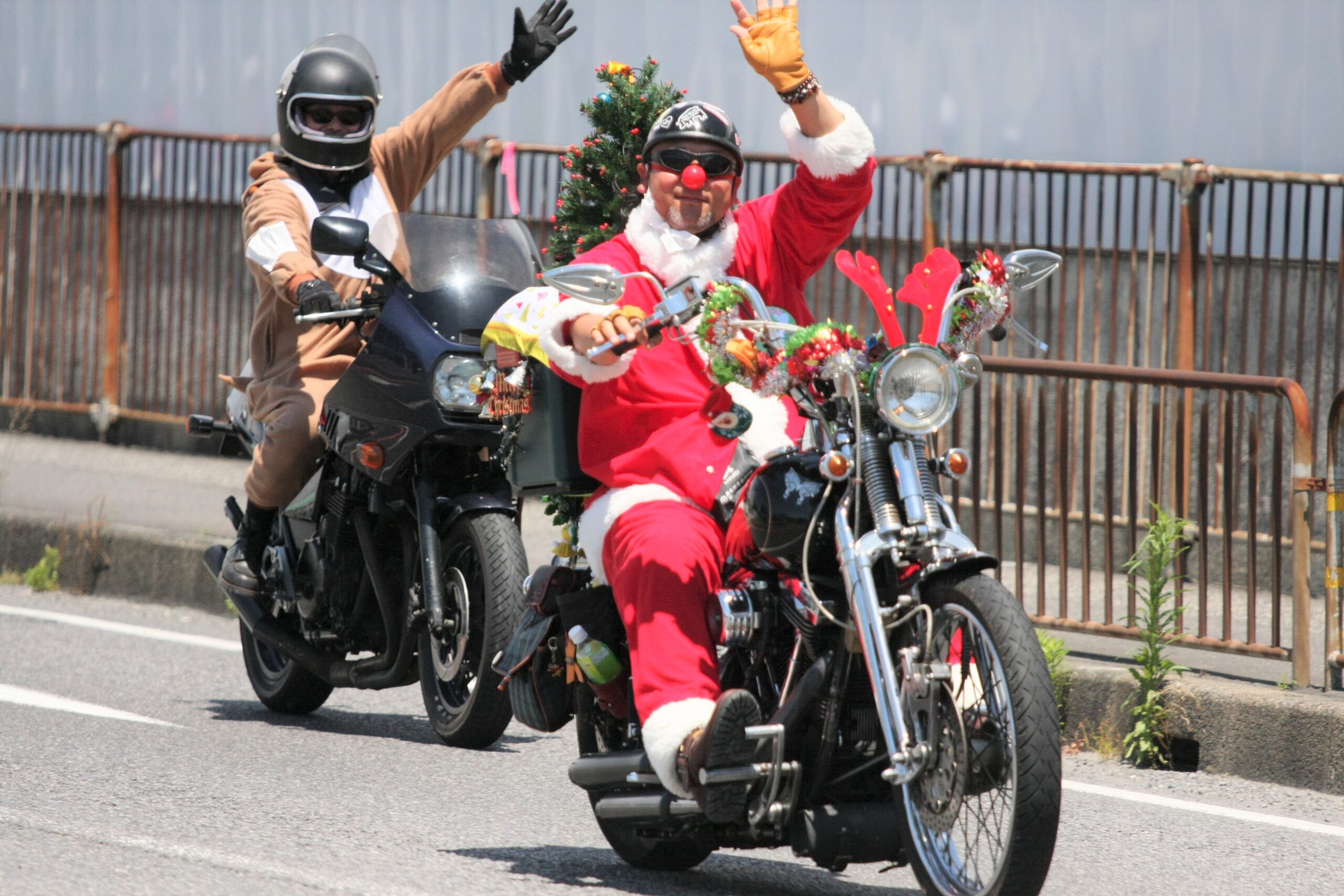 「あわてんぼうのサンタライダー」たちが街に繰り出し陽気なパレードをしながら、街の人たちに「Yaeh!(ヤエー!)」で挨拶すると、それを見た人も笑顔で手を振ってくれました。