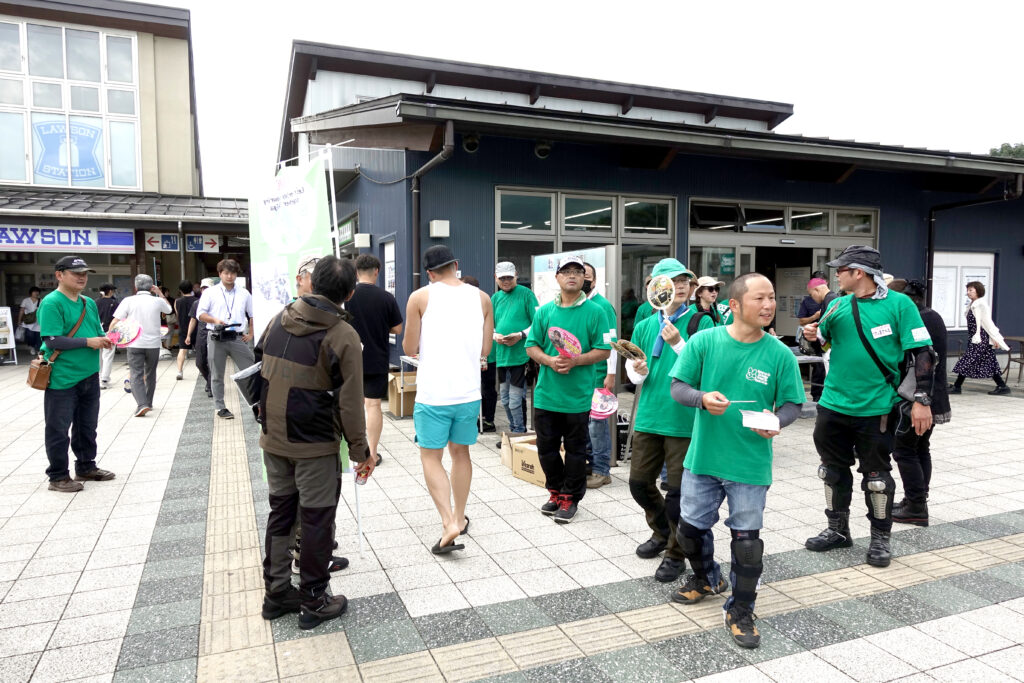 緑シャツの参加者たちが『事故の内容にお気をつけてお出かけください』と元気よく声をかけながら、いろいろな協賛企業様からいただいたノベルティを配布。